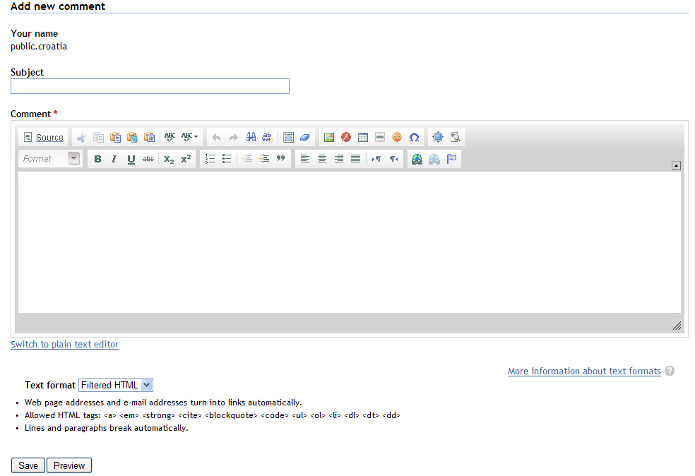 A new comment can be created by using the “Add new comment” form at the end of a topic page and then save.